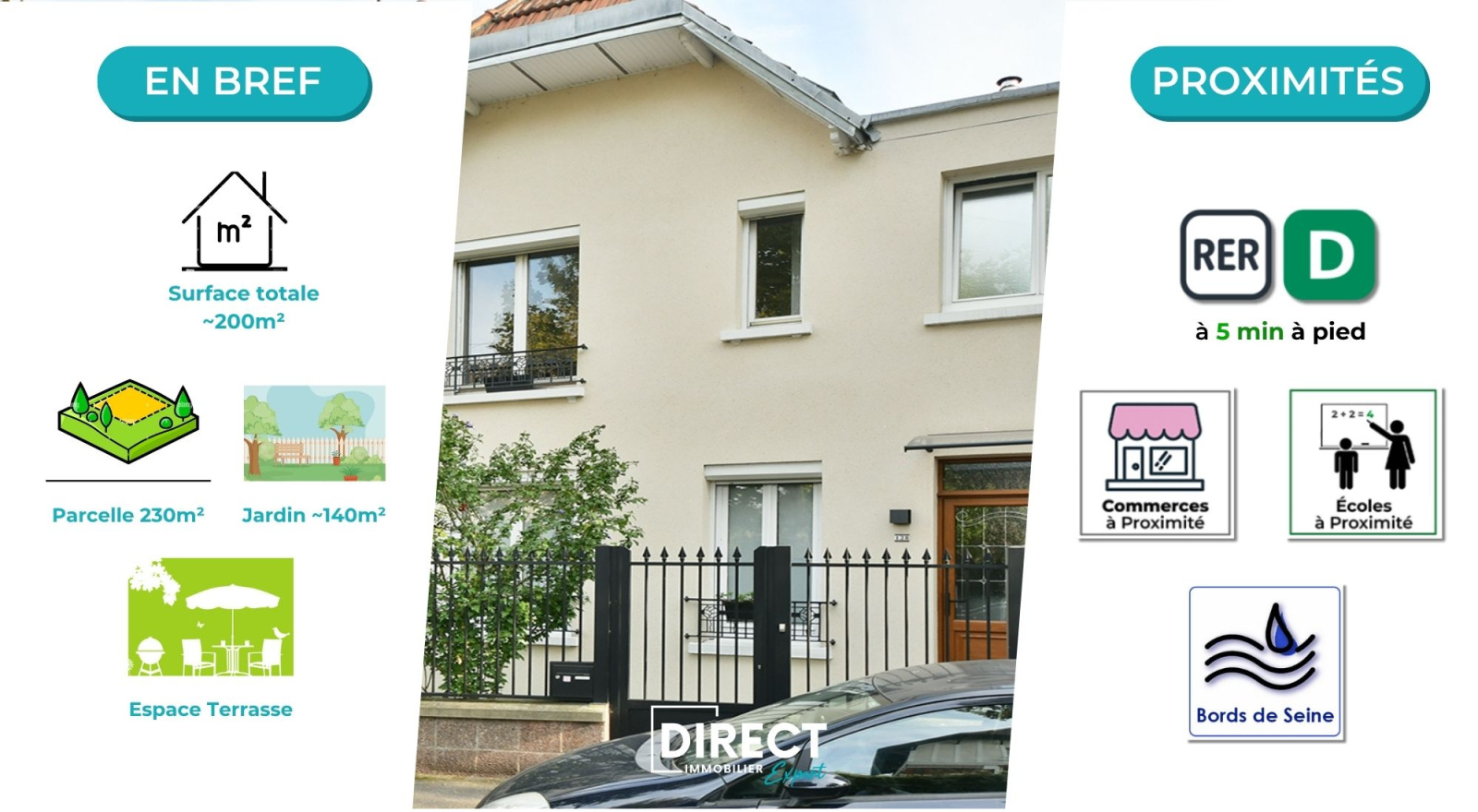 Implantée sur une parcelle de 230 m², à seulement 5 MINUTES À PIED DU RER D, à deux pas des ÉCOLES (sectorisation DOLET), COMMERCES DE QUARTIER et BORDS DE SEINE, cette maison vous garantit une qualité de vie idéale pour toute la famille.