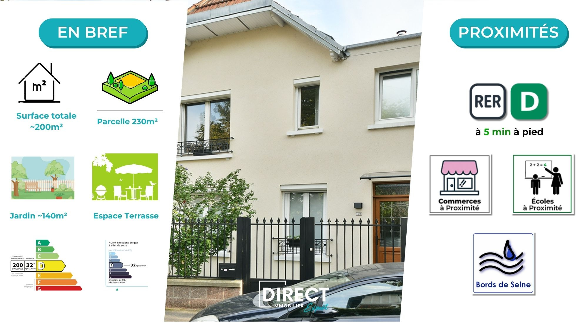 Implantée sur une parcelle de 230 m², à seulement 5 MINUTES À PIED DU RER D, à deux pas des ÉCOLES (sectorisation DOLET), COMMERCES DE QUARTIER et BORDS DE SEINE, cette maison vous garantit une qualité de vie idéale pour toute la famille.