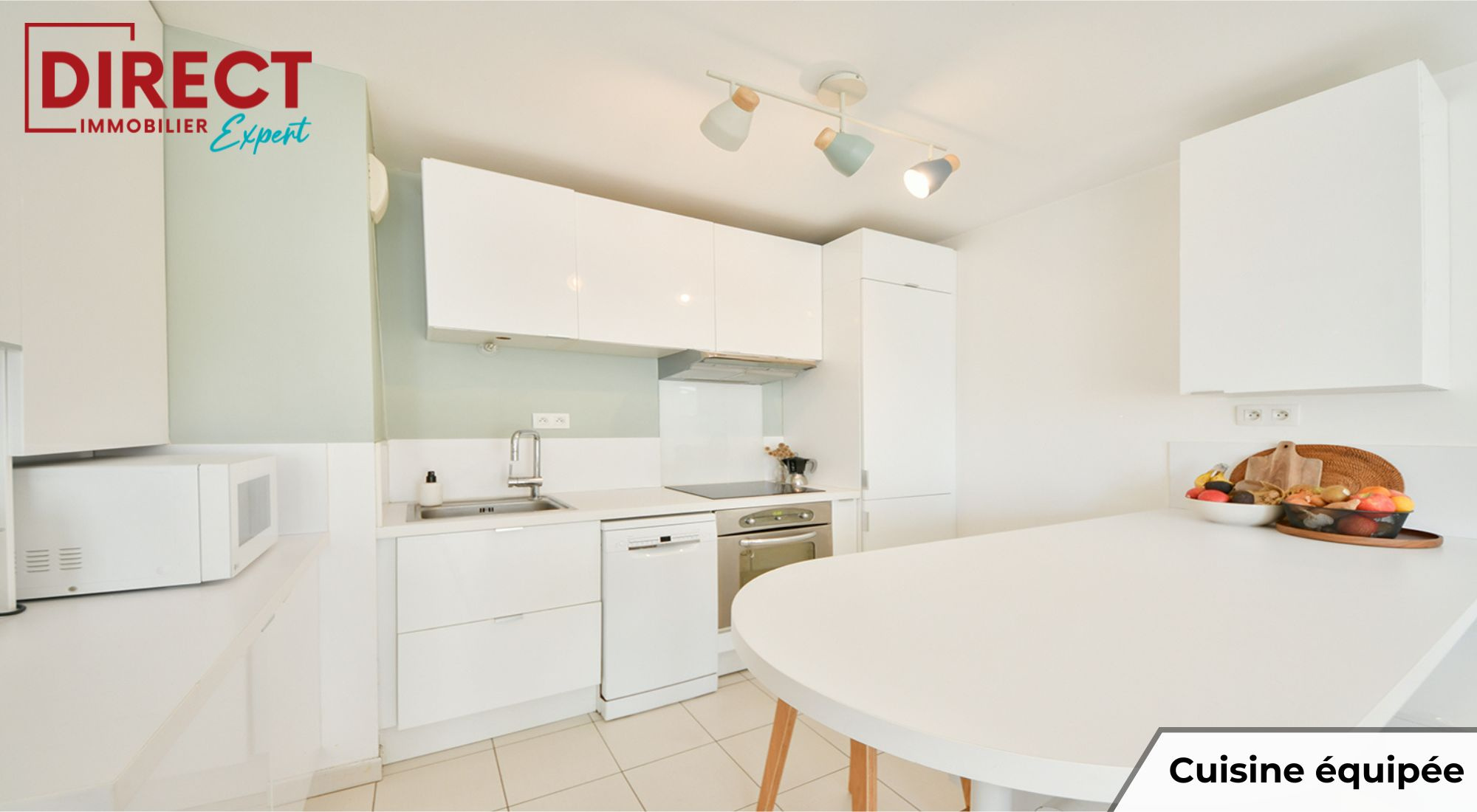 Un SÉJOUR spacieux et lumineux avec CUISINE OUVERTE entièrement équipée, donnant accès à un grand BALCON de 11 m²