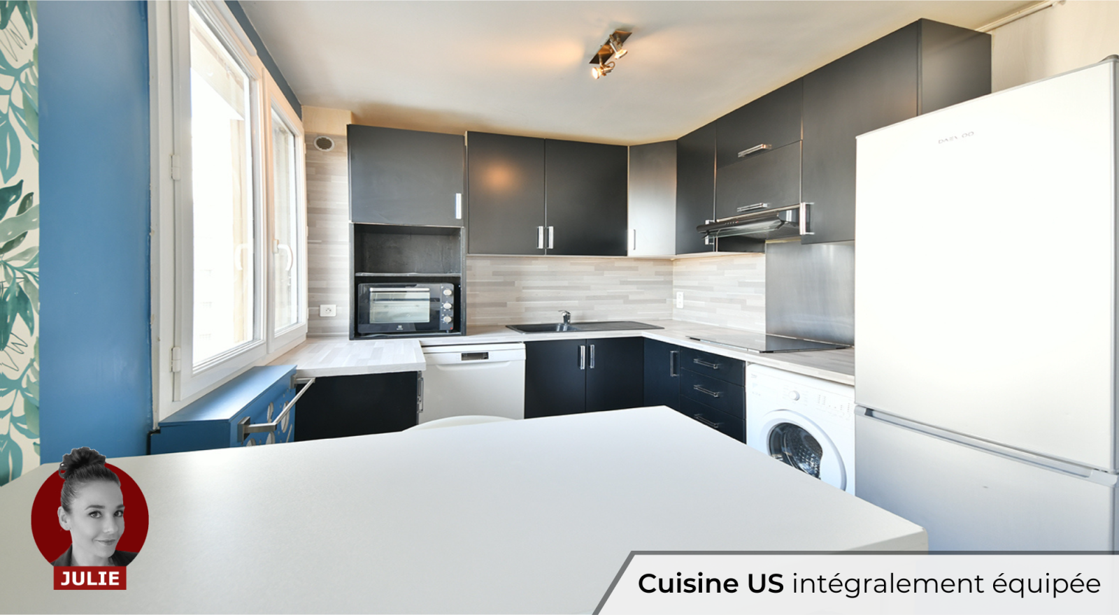 - Une cuisine ouverte (US), entièrement aménagée et équipée