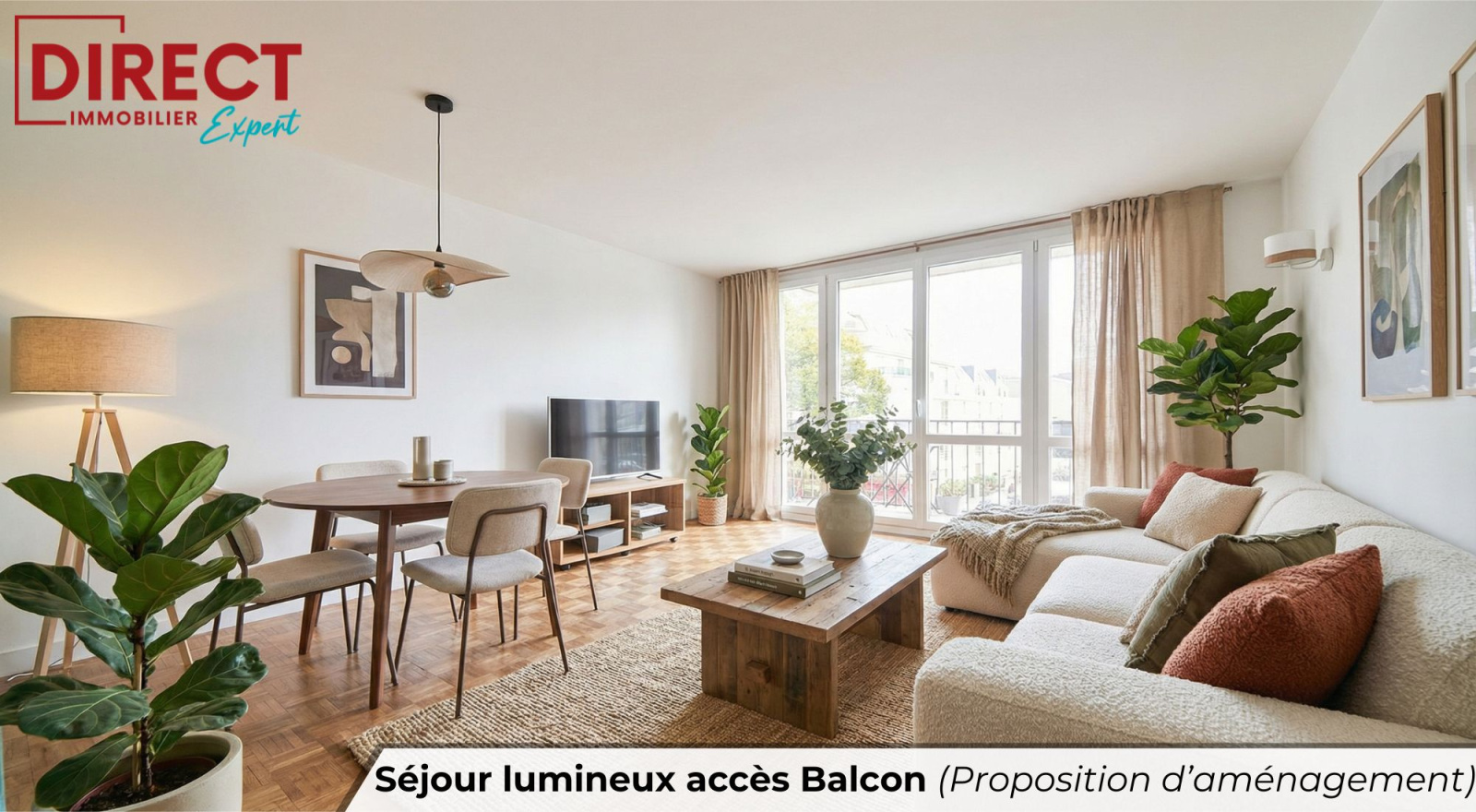 Le séjour chaleureux avec espace salon / salle à manger s’ouvre sur un balcon exposé plein SUD, parfait pour profiter du soleil et prolonger agréablement l’espace de vie.