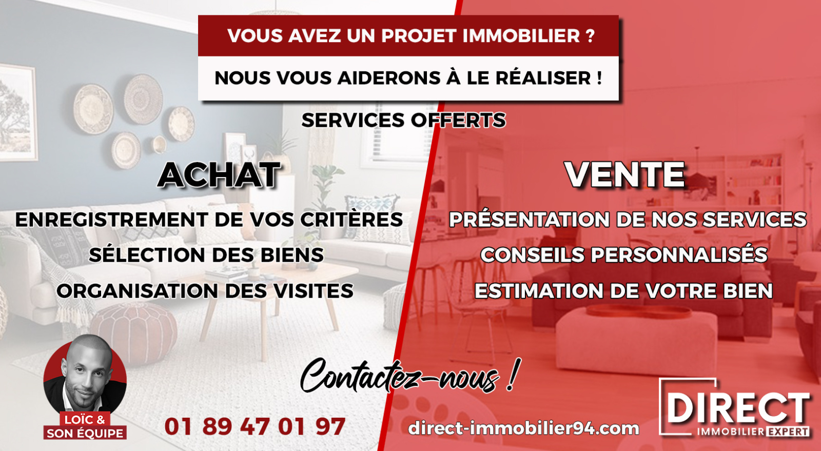 Pour plus d'informations et/ou organiser une visite, contactez dès maintenant l'agence DIRECT Immobilier Expert au : 01 89 47 01 97. Nous nous ferons un plaisir de vous accompagner dans votre projet.