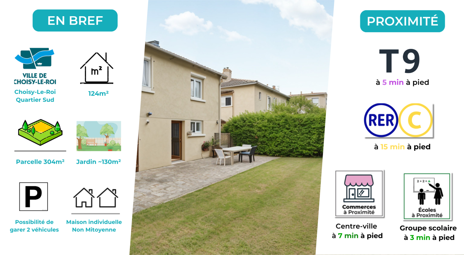 Située dans une RUE RÉSIDENTIELLE et CALME à deux pas du centre-ville de CHOISY-LE-ROI, cette charmante MAISON NON MITOYENNE de 123 m² vous séduira par son JARDIN INTIMISTE, sa TERRASSE ENSOLEILLÉE et son EXCELLENT DPE en B grâce à une pompe à chaleur performante.
