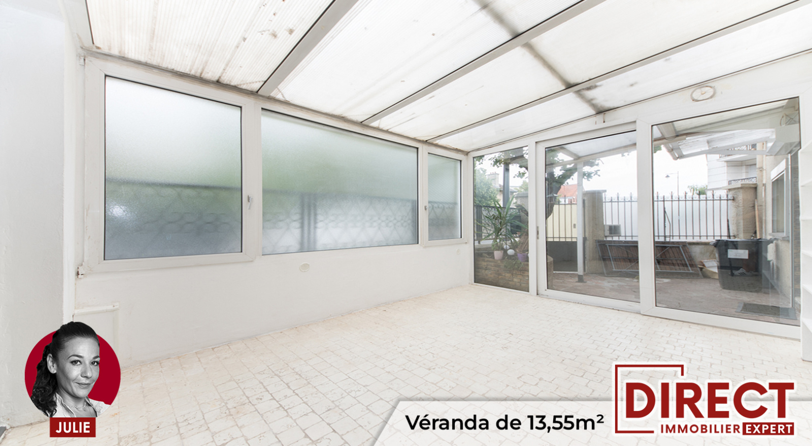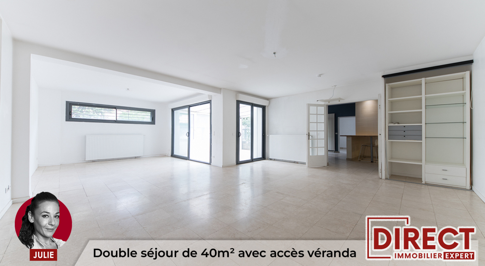 Au rez-de-chaussée, vous découvrirez un spacieux séjour double de près de 40m² avec un accès à une véranda de plus de 13m², une cuisine ouverte, une chambre ainsi qu'une salle d'eau avec toilettes.